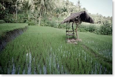 Against my protests Anom takes me in. "Balinese people are friendly," he says. Within moments I'm offered a chew of betel nut which I decline and triangles of sweet sticky rice which I accept. Around a corner I'm greeted by a man with bloody hands. He raises them to the camera while the pig he has just slaughtered is having its bristles singed off. Soon we are biking through the village of Kanjung where thousands of kitchy statues line the road. Anom takes a sharp right and we're plunged into peaceful rice fields. At Tegallalang every hillside has been sculpted into small paddies filled with water and the brilliant green of tender shoots. It is perhaps the most beautiful sight I have ever seen.
