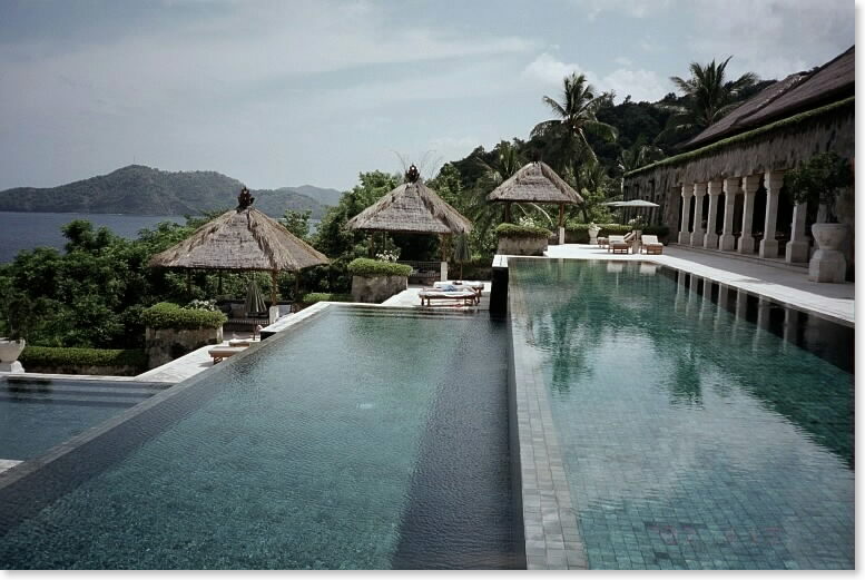 The bathroom is terazzo-tiled, the deep tub strewn with petals. In the dressing room a plush divan sits under a window facing a tangle of exotic plants. When I stand on my terrace I look down at a long private pool flanked by 2 open pavilions, their raised floors covered with thick mattresses and pillows. Behind each is a square lily pond canopied by palm trees, all hanging over a cliff with the beach and ocean below.