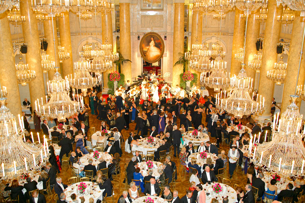 We'd been told that only three to four hundred of the 2,500 or more attendees of the Imperial Ball were coming for the banquet that preceded it. All of them that evening seemed to have arrived moments before our taxi deposited us at the entrance to the palace. They were gathered in the foyer at the foot of a marble staircase bordered with huge bouquets of red carnations. Crystal chandeliers twinkled overhead while palms spread languidly against white-columned walls. Footmen dressed in 19th century finery stood motionless between the columns. As we mingled with the throng, similarly costumed waiters offered a champagne cocktail to the lady from New York who discretely examined the fashionable European women, awarding points.