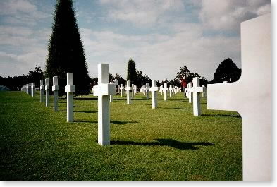 Above Omaha Beach, rows of white marble crosses and Stars of David marked the remains of 9,387 servicemen and women. Visitors wandered silently among them. "Amazing," said the lady from New York. "It's so peaceful. And it just goes on and on."