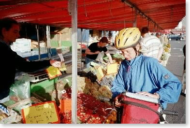 Next morning an overview of the ride to Saint Malo was presented on a terrace high over the water. Then began a glorious cycle to the seaside village of Cancale where fresh oysters were being pried open. "Uphill begins at the traffic circle," read the itinerary we kept tucked in the plastic windows of our handlebar bags. "Thanks for sharing," we thought. From a cliff road that hugged the coast we cut inland through fields of vegetables ripe for picking. Above us the sun shone in a cloudless sky, warming the late August breeze. Magnifique!