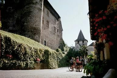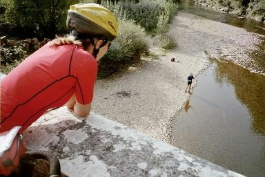 By Viellevie we've split into two groups of almost equal numbers. The slower, mine, stops to admire the hamlet's massive medieval castle and the rest of the village which could easily fit inside. Just out of town, Robert, an avid fly fisherman, stands on a bridge gazing longingly at a large trout feeding in the shallows. "Do we have to ride by the river?" he asks plaintively. "We'll throw you in if it will make you feel better," one of the women replies, quite possibly his wife.