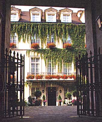 The inn has 55 rooms on four floors, 30 "normal" ones, 15 junior or larger suites, and 10 duplexes. Antiques are country pieces, and tables and chairs are more rough hewn than in the Palace hotels with their ornate furnishings. In addition to the entry courtyard, there is another small court enclosed by the hotel. Sitting at a window is to be miles away from the capital of France.