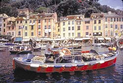 When dirt turns to pavement, we know we're almost there. We see sprawled against the hill the Splendido. What makes it so? Is it Greta Garbo, Clark Gable, the Duke and Duchess of Windsor? They all stayed in this most luxurious of luxury hotels. We switchback downrds, catching glimpses of a tiny bay and hints of shiny white hulls. One more turn and we're at eye level with the top of a belfry. Then we plunge into the first narrow winding street walled with pastel-hued houses funnelling us into the heart of Portofino.