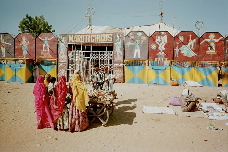 It was dark when we climbed back into the carts and were ferried over the human sea. Past the neon lit ferris wheels and the man-powered carousel, the tables of bracelets and beads, past figures squatting motionless at the road's edge, past open-air barbers, sweets shops, harness makers, blanket sellers, all semi-obscured by darkness and smoke. Then we veered into the silent plain where shadows flitted past cooking fires, camels kneeled at rest and sharp-horned bullocks nodded their massive heads as we rode above them like visitors from outer space.