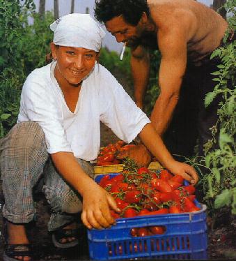 Up and down the rows we walk, Giacomo stopping to point out particularly abundant yields. Now, the soil speaks to me-and I'm at a loss for words. I can only shake my head in wonder. As we return to the car, a worker with a bunch of grapes greets us and passes them around. The man shows me his hands, stained black as if by a permanent tattoo. "It's from picking tomatoes", he tells me. "The juice from the stems. Hard work," he gestures with a grin and waves us on our way. The fresh tomatoes I've seen wi 'II go to supermarkets in Rome, Ancona, Florence-throughout Italy. Next year, they will be in the La Bella San Marzano brand of canned tomatoes (with a ripe, beaming, and bosomy maiden on the label, her lips and fingertips lacquered red like the san marzanos in her golden crown) and shipped to the United States. Then, as Savino comments, as he drives me back to the hotel, who knows? Nicola may be able to buy another Alfa Romeo.