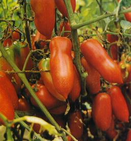 So the tale of the San Marzano tomato is part scientific, part anecdotal and totally debatable. We know that it is indeterminate in nature (bears fruit over an extended period), has a small seed cavity that can be scooped out leaving all meat and peels easily. It ripens in about 80 days after transplanting in the U.S., 60 to 70 days in San Marzano's volcanic soil, is resistant to cracking, cylindrical with two longitudinal depressions and has fruit grouped in bunches of 5 or 6 or more.