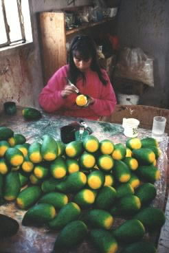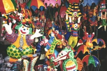 Heidi is a painter and art teacher, so the walls are hung with fanciful masks, primitive paintings and sophisticated paper cutouts, all for sale. To find artisans at work is the job of a young local guide, Dali Amaro. Winding through the narrow streets, he leads his charges to an abandoned hotel where tinsmiths cut birds' wings out of shiny sheets of metal. Outside in the courtyard, young women put the finishing touches on brightly painted wall plates. By a muddy river skirting the town a crumbling building hides a busy papier mache factory. Here women paint hundreds of pears and bananas and apples in brighter-than-life colors. Up the hill in another workshop, stone masons chip at great blocks, the first step in forming the crosses that lean against a rickety tin shed.