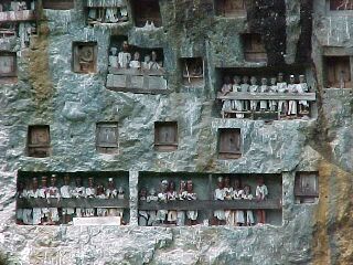 The Dutch put an end to that practice in the early 1900's, but noone to this time has curtailed the sacrificial slaughter of water buffalo and pigs, symbolizing the release of the deceased's soul and the repayment of gifts that he or she had made on similar occasions. This, if they're lucky, is what the tourists will see, and a great deal more. When a high-born Toraja dies, the body remains in a brightly wrapped wooden coffin until the funeral takes place.